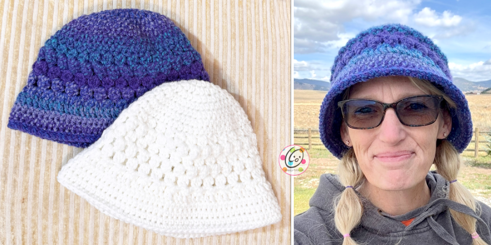 This is designed to be a loose fitting bucket hat, made from a bulky weight yarn. For a more fitted version, use a worsted weight yarn. The samples are teen/adult size.