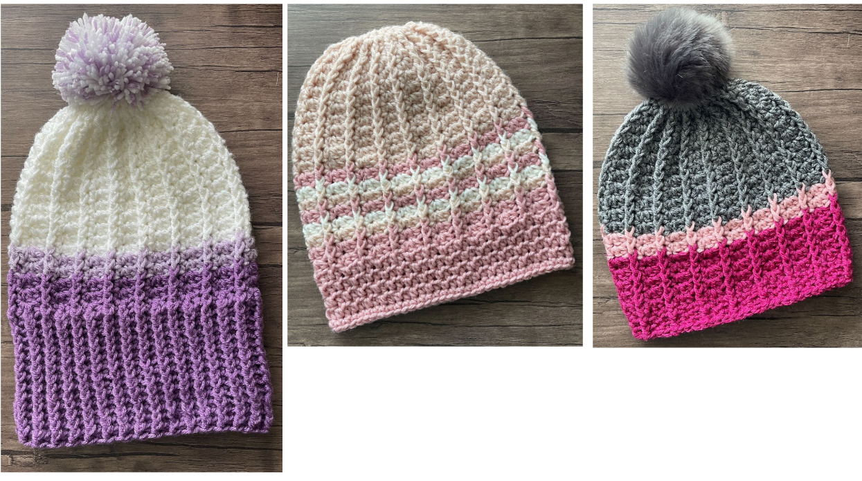 Sample yarns: White and purple beanie – Red Heart Super Saver Pale Plum, Medium Purple, Metallic White; Grey and pink beanie – Red Heart Super Saver Heather Grey; Red Heart With Love Bubblegum; Shades of pink beanie – Red Heart With Love Sweet Pink, Bubblegum; Red Heart Super Saver Soft White. - Crochet Hook: I (5.5mm), J (6mm)