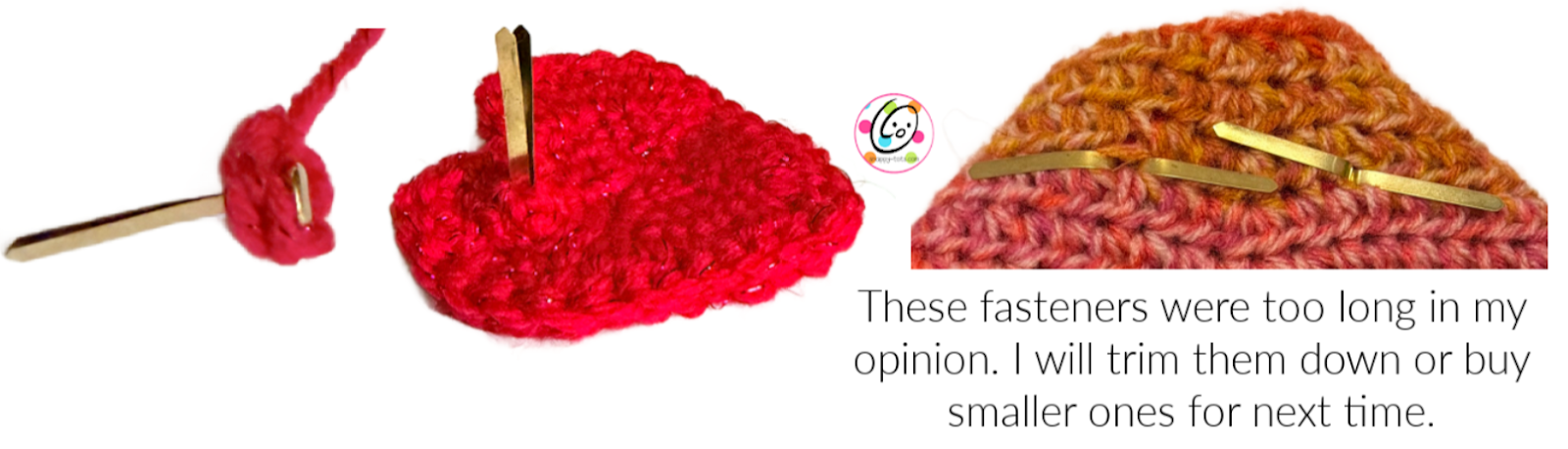 Optional for Interchangeable heart: 2 – 1” brads (paper fastener) - Gauge: 4” with an I hook = 13 hdc sts and 10 rounds