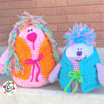 “Hair”: Cut 5 strands of yarn (various colors) 6” long. Fold the strand in half and pull the center loops through a st at the top edge of the turkey, right above the eyes. Pull the ends through the loops until snug. Pull the yarn tails apart for a frizzy look.