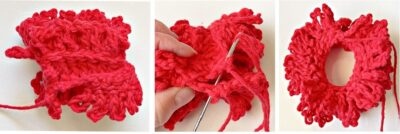 8. Finish off, leaving a long tail for sewing a side seam. With right sides together, fold the piece in half, matching the ends. Yes, this is a little tricky with all of those loops. The good news is this seam won’t be seen. Just do your best and try not to catch any loops.