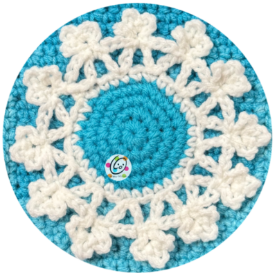 Attach the snowflake either by snap or use a yarn needle and matching yarn to sew the first round of white and the tips of the snowflake to the banner.
