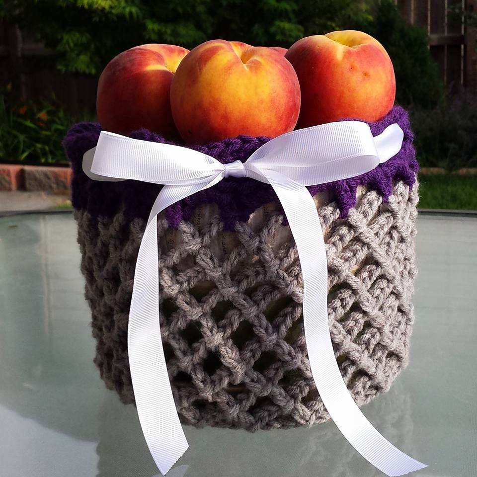 I really enjoyed using the yarn. The pattern can also be made from other bulky weight yarns, light weight rope, jute. See sample made with Red Heart Reflective yarn below.
