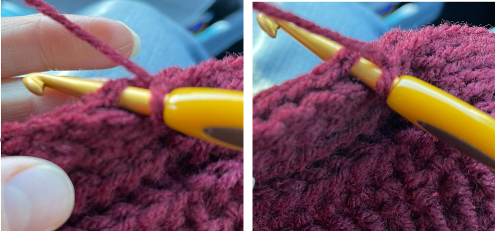 Note: Instead of working a regular FPDC increase on this round (2 FPDC around the next post), a regular hdc is worked IN the st and a FPDC is worked around the post (previous round, NOT the hdc just worked). This makes the transition from hdc rounds to FPDC rounds much smoother. This is done only on this round.